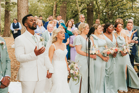 Their woodland ceremony was gorgeous, and the weather was perfect ā warm with just a few clouds, not too hot, not too cold, just spot on for celebrating outdoors. The day was packed with big moments ā hilarious speeches, emotional ones too, and one of the absolute highlights was Jessica surprising everyone by singing, which had the whole room in tears.